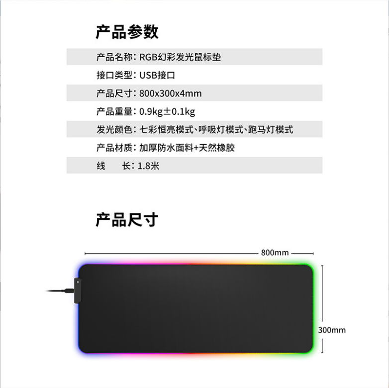 炫彩RGB游戲鼠標墊,織物面料編織,表面細膩、平整、操作穩(wěn)定,帶燈光切換按鍵,輕輕一按,燈光可自由切換,加厚橡膠底部,穩(wěn)固防滑